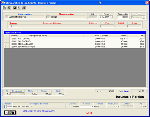 Da salida de un insumo en peso y entrada de otros insumos en porciones.