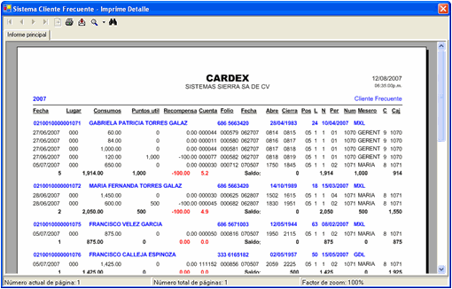 Muestra el consumo de cada cliente, la frecuencia de visitas y las recompensas otorgadas.