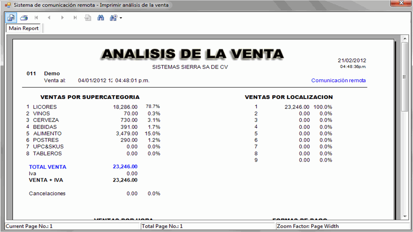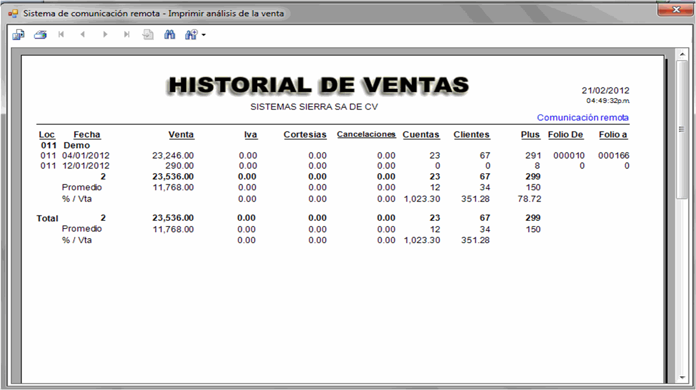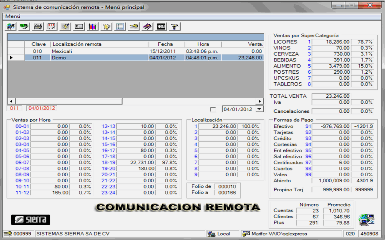 Le permite consultar las ventas de todos sus restaurantes o bares desde cualquier parte del mundo, de manera gerencial. Tanto ventas del momento como de días anteriores. Comunicación Remota y Análisis de Ventas se basan en el concepto de analizar las ventas al día. En Análisis de Ventas se hace un estudio más detallado de una sola localización, mientras que en Comunicación Remota exhibe los principales conceptos de estadística de ventas de varias localizaciones.