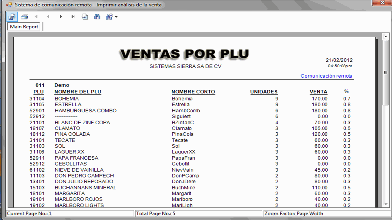 Imprimir el reporte que se exhibe en la pantalla principal. El cual incluye: ventas totales, por localización, por hora, por categoría, por PLU, entre otros.