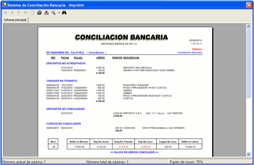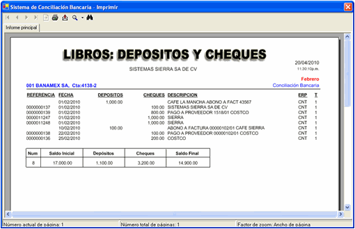 Exhibe información de conciliación bancaria, partidas en conciliación (movimientos pendientes de cuadrar) y depósitos y cheques conciliados.
