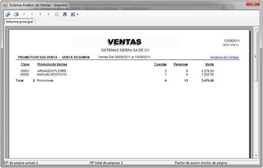 Controlar las cuentas impulsadas por promotores de venta. Se accede a él por medio de Análisis de Ventas. El módulo de Promotores de Venta permite:
